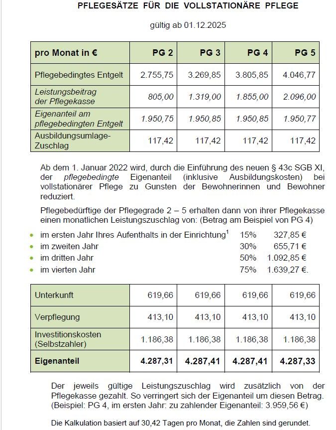 Wir bietet Ihnen eine Unterkunft, Verpflegung mit Vollpension sowie umfassende Pflege- und Betreuungsleistungen. Die gesetzliche Pflegeversicherung übernimmt, abhängig vom jeweiligen Pflegegrad, einen Teil der Pflegekosten.
