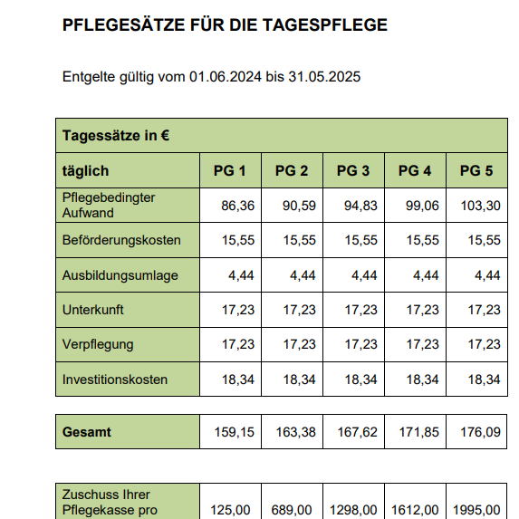 Pflegesätze für die vollstationäre und Kurzzeitpflege
